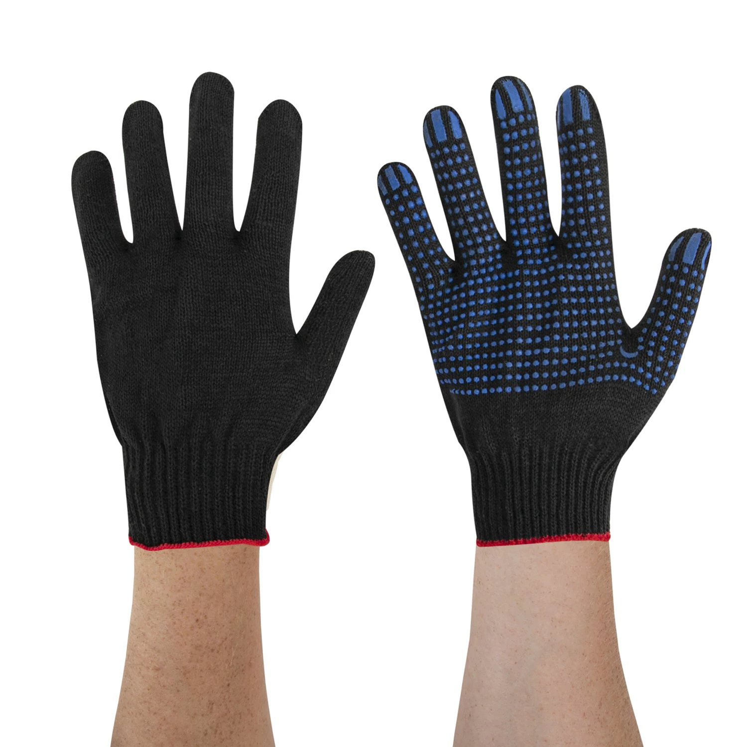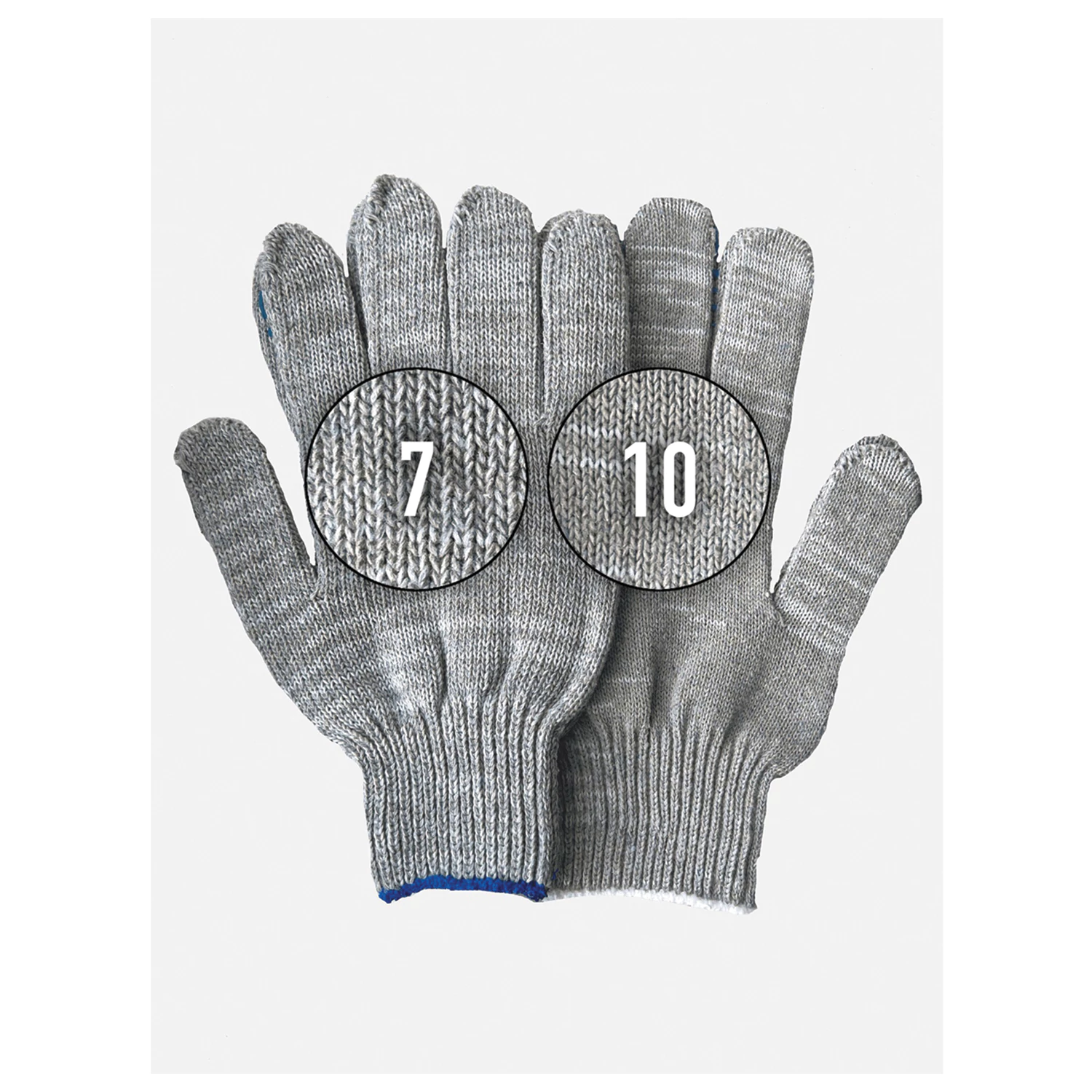 СПРАВОЧНАЯ ИНФОРМАЦИЯ: на последнем фото можно ознакомится с визуализацией разницы между 7 и 10 классами вязки перчаток. Перчатки защитные пвх 7 класс вязки – менее плотное плетение и более толстые нити. Защитные перчатки для работы 10 класс вязки – более плотное плетение и стандартные нити, тоньше, чем используемые в 7 классе. Трикотажные защитные перчатки 13 и 15 классы, к примеру, с еще более мелкой структурой вязки, с применением более тонких нитей, чем при вязке 7 и 10 класса. 13 и 15 классы вязки рабочих защитных перчаток – еще более плотная вязка и более тонкие, но при этом более прочные нити, чем в 7 и 10 классах. Чем выше класс вязки защитных перчаток для работы, тем более тактильные перчатки. Х/б основу 13 и 15 классов применяют для более дорогих перчаток и используют как основу для перчаток с латексным, нитриловым и другими обливами, т.к. плотная вязка не дает обливу проникнуть внутрь перчатки, а позволяет равномерно распределиться по поверхности.