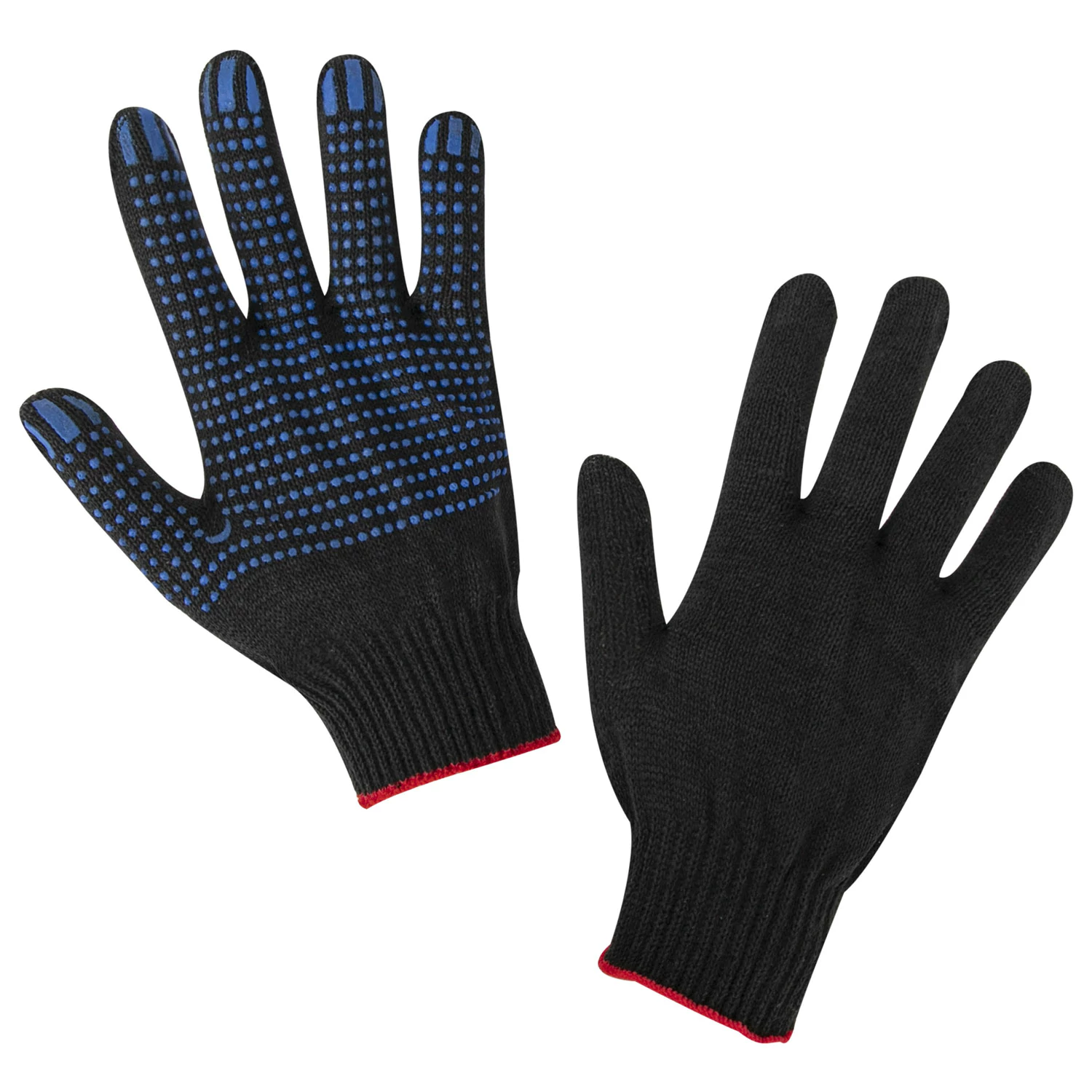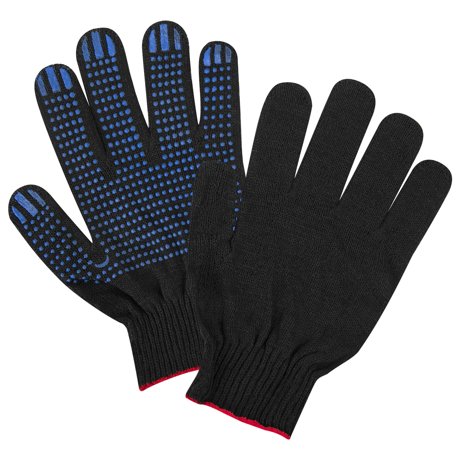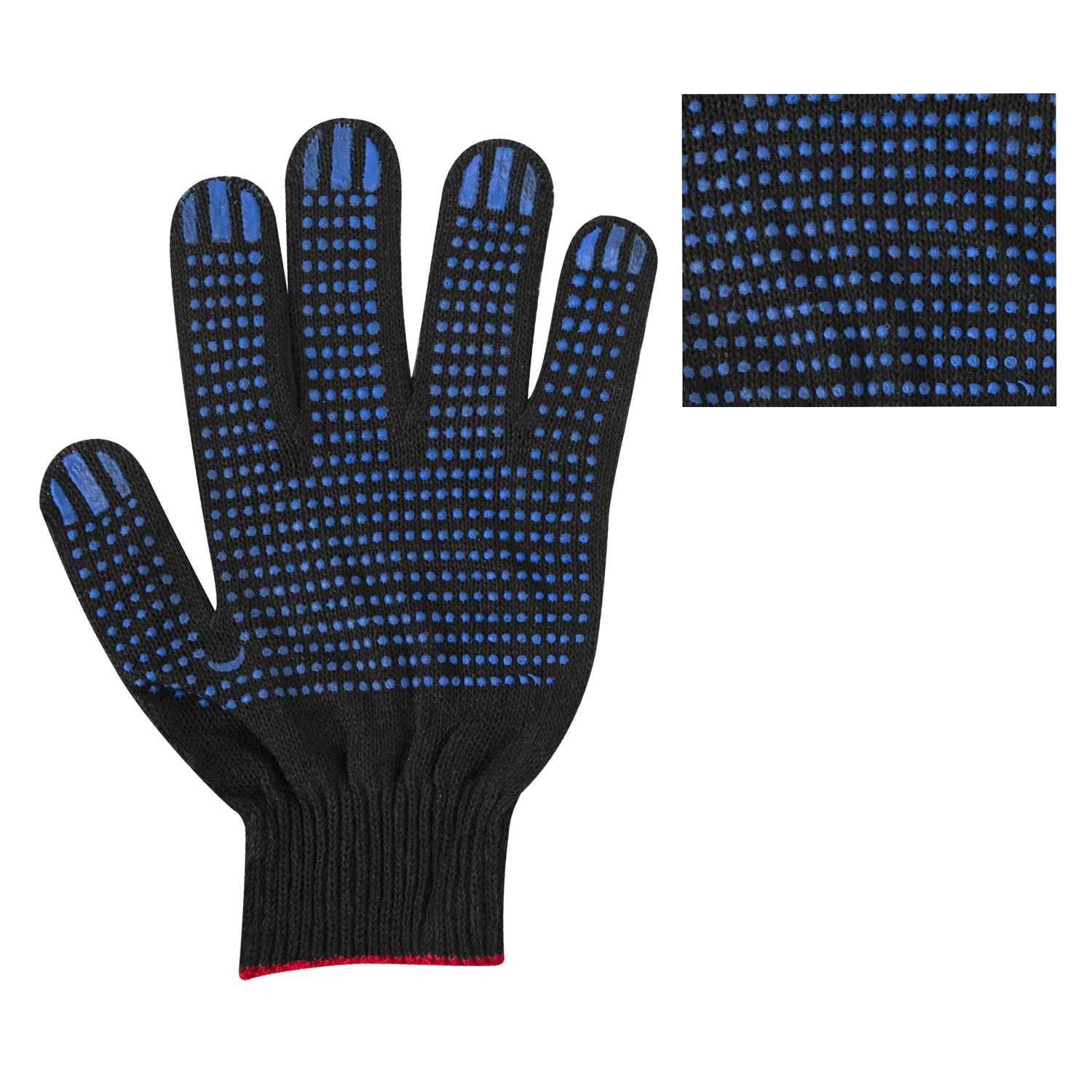 Перчатки трикотажные с покрытием пвх изготовлены из хлопчатобумажной пряжи плотностью 133 текс с нанесением рисунка на внутреннюю сторону перчатки. Покрытие из пвх помогает обеспечить плотный захват и предотвращает соскальзывание детали. Резинки на манжетах обеспечивают плотное прилегание перчатки к руке. Рабочие защитные перчатки белого цвета, с покрытием из поливилнилхлорида, имеют 10 класс вязки. Вес пары - 50-52 г. поставляются в комплекте 5 штук в полиэтиленовой упаковке.